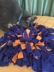 And the confusion continues, as you now ponder what it is for. No, it is not a fluffy dog washing mitt, although it might work for that. But you were, in fact, correct in your assumption that it was for your pet. A snuffle mat is used for enrichment for your pet. You hide treats or their kibble within the mat’s fleecy tendrils, and your pet must root around to find them. I suppose I should say snuffle around to find them! For those pets that love food and tend to hover in everything in sight, a snuffle mat will slow them down, well at least a little.