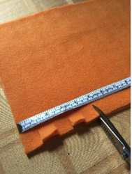 Once you have all your supplies ready, spread out your fleece. We are now going to cut our strips. I made my strips 1 inch by 10 inches long. Start by cutting off a piece of fleece that it is 10 inches long. Set aside the remaining fleece. Spread out your 10-inch chunk. Place your ruler over the fleece at the edge. Make small cuts every inch; these will be your guide marks for your strips. Then cut out the strips. Don’t worry if they aren’t perfectly straight, but try your best! You can also lay two 10-inch chunks over the top of one another and cut your strips two at a time if your scissors can handle it. This is the time-consuming aspect. To keep your sanity, you might want to find a friend to help with all the cutting! I ended up using 175 strips in the blue and orange Snuffle Mat.