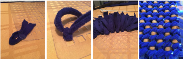 Once you have finished cutting out all the strips, or need to take a break from cutting to maintain your sanity, take one of the pieces of fleece and fold it in half in your hand. From the bottom side of the mat, feed through the two ends of fleece through two adjacent holes. This should result in the two halves sticking through the other side of the mat, where you can then tie them together in a knot. Continue to do this will all the fleece, until your mat is nice and full. You may need to go through the holes more than once in different directions.